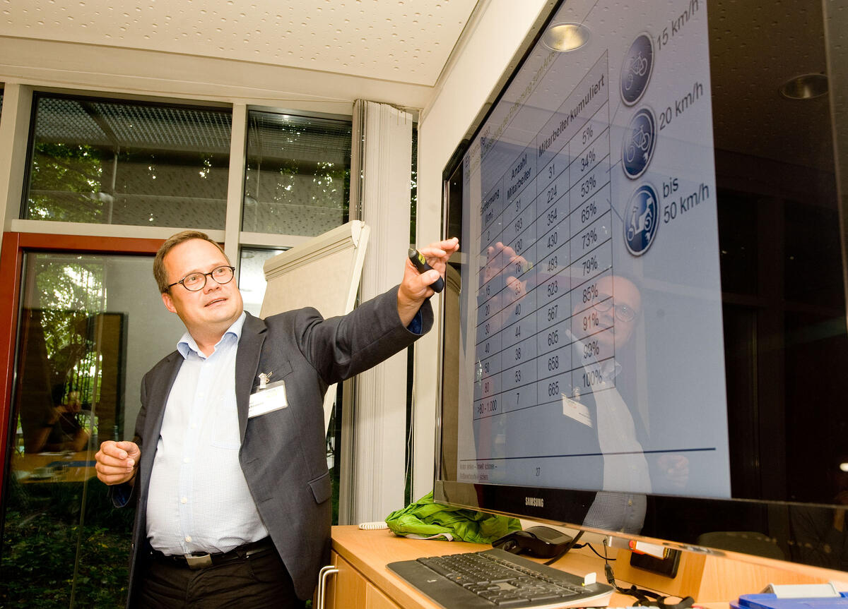 Im Anschluss an diesen Vortrag brachte uns Michael Schramek, Geschäftsführender Gesellschafter von EcoLibro, den Schweriner Versuch näher. Bei diesem testeten 10 Menschen über einen Zeitraum von 10 Tagen verschiedene Verkehrsmittel auf der gleichen Strecke. Nach dem Testzeitraum wurden die Daten unter Kriterien wie Gesundheit, Dauer der Fahrt von Tür zu Tür, CO2-Ausstoß und Bewegung ausgewertet. Durchschnittlich am Schnellsten war das E-Bike. Bemerkenswert: Fahrten mit dem E-Bike verursachen 3.000% weniger CO2-Ausstoß als Fahrten mit dem fossil betriebenen Auto. Ein weiterer wichtiger Faktor war die Bewegung. Wie in der Gesamtwertung lagen hier Fahrrad und E-Bike vorne.