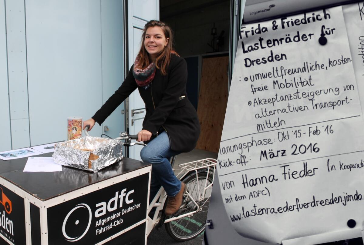 Im Gegensatz zu herkömmlichen, städtischen Transportmitteln sind Lastenräder leise, produzieren keine schädlichen Treibhausgase und es macht großen Spaß sie zu fahren. Durch ein spendenbasiertes Verleihsystem schaffe ich die Möglichkeit, zwei Lastenräder in Dresden kollektiv zu nutzen. Diese sind groß genug, um damit kleine Kinder, Möbelstücke oder Grillzubehör sicher zu transportieren. Damit fördere ich die gesellschaftliche Mitgestaltung auf dem Weg zu einer post-fossilen Gesellschaft und das Erreichen der kommunalen Klimaschutzziele. Außerdem